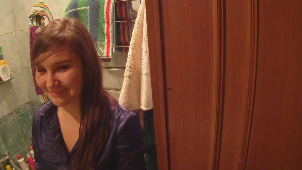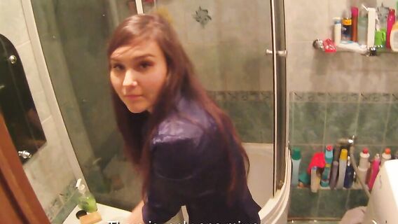 Случайный незнакомец очень понравился русской девушке, и она пригласила его домой, под предлогом помощи. Милая длинноволосая брюнетка отдалась ему в ванной, впустив большой член в рот и киску.