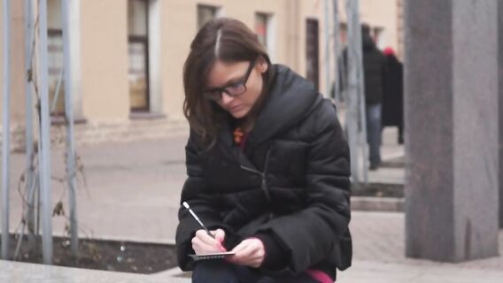 Знакомство на улице со скромной студенткой быстро переросло в страсть. Девушка отдалась парню без сопротивления, и их приятный секс с оральными ласками закончился спермой на её очках.