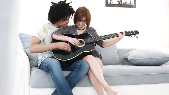 Урок по игре на гитаре затянулся и стал скучным. Репетитор отложил инструмент и, вылизав очкастую ученицу, он потрахал её в разных позах на диване, и кончил ей внутрь не вынимая члена из киски.