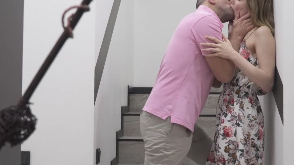 Лысый чувак с порога набрасывается на шатенку в платье и капроновых гольфах, ему не терпится овладеть ею и, сняв всё лишнее он трахает её на большой кровати, сливая сперму на её животик и лобок.