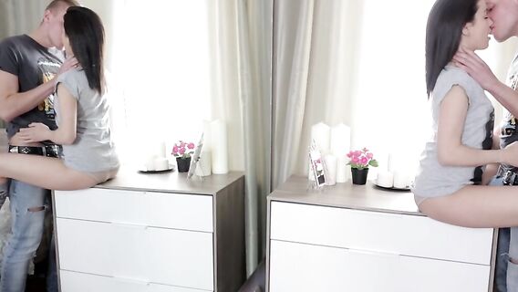 Юная брюнетка и её молодой человек уединяются в спальне, чтобы придаться наслаждению. Красивый половой акт русской пары, с минетом, куни и аналом очень романтичный и заканчивается кремпаем в попку.