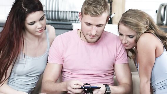 Шатенка и рыжая играются с русским парнем в соблазнение и возбуждают его. А он развлекается с ними по взрослому, занимаясь сексом сразу с двумя юными девушками, входя во все их дырочки по очереди.