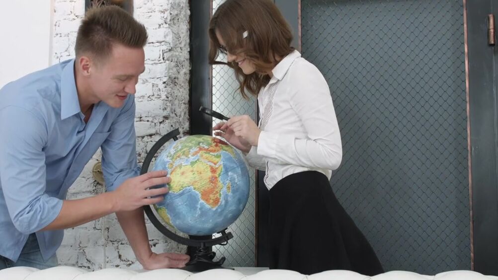 Русский парень с большим членом намерен как следует оттрахать голую юную телку в черных гольфах и в порыве страсти устраивает ей двойное проникновение, погружая член в анал, а пальцами трахая киску.