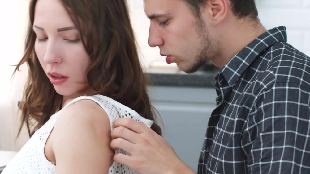 Длинноволосая русская девица забывает о своем журнале, когда руки парня ложатся на её попку, она соглашается на трах, на кухонном столе, после которого сглатывает сперму, которая попала на её язык.