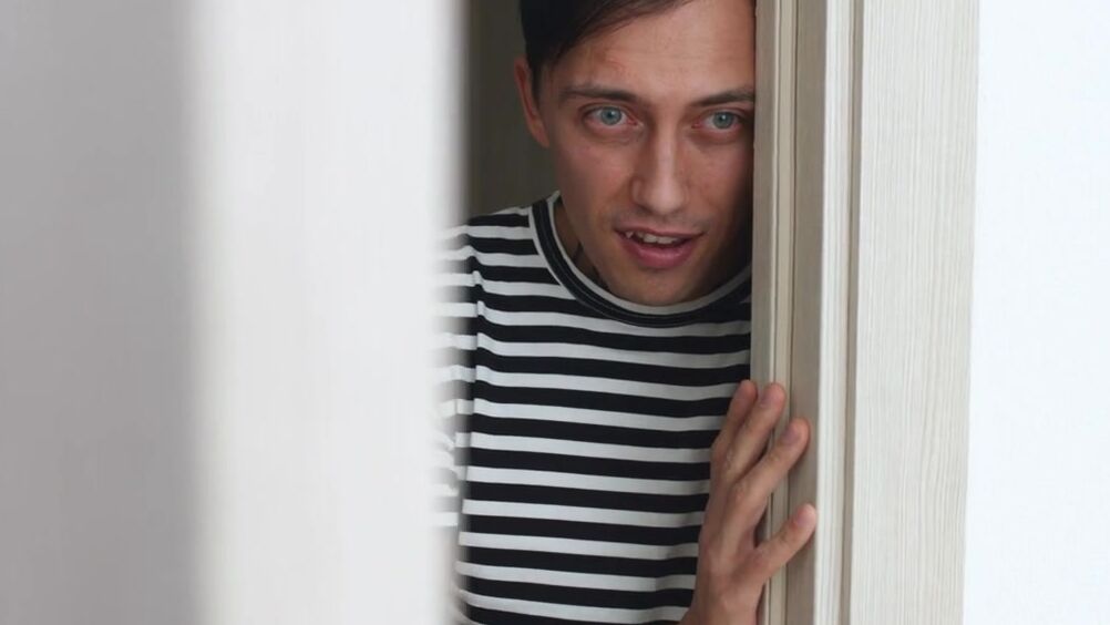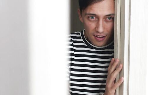 Миловидная русская брюнетка с натуральными сиськами и татухами на животе очень горячая любовница, парень с большим пенисом ебет голую телку стоя у комода, в позе на боку, раком и кончает ей на попу.