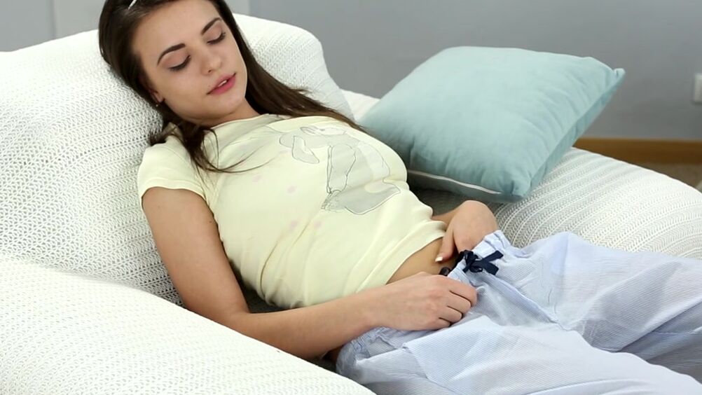 Молодая русская девушка с ободком в волосах, задирает футболку и спускает штаны, чтобы поласкать себя и насладиться коротким соло, она массирует пальцами клитор и кончает сидя на полу.