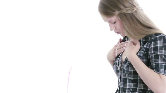 Русская девушка шатенка, снимает рубашку и шорты с трусиками, оставив на себе только белые носочки. Немного потрогав себя руками, она спускается к промежности и мастурбирует, массируя вагину пальцами.